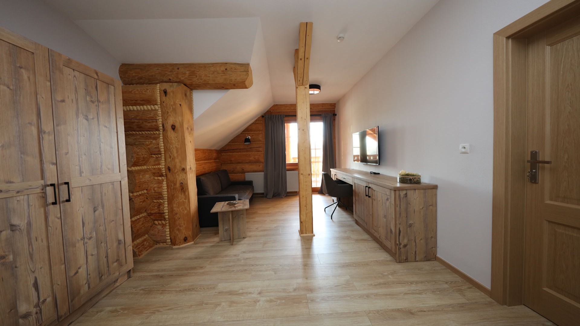 To największy z naszych apartamentów. Odpowiedni dla Młodej Pary na tę najważniejszą noc, ale pomieści i powiększoną rodzinę, gdy po kilku latach powrócą do nas, by świętować swoją rocznicę. Składa się z sypialni z dużym, wygodnym łóżkiem, toaletką i sofą oraz z przestronnego z saloniku z rozkładaną sofą. W obu pomieszczeniach są telewizory. Ogółem apartament Romanka pomieści więc od czterech do sześciu osób. W łazience znajdziecie Państwo zarówno wannę, jak i kabinę prysznicową. Do dyspozycji gości jest również dodatkowe WC. Na dużym tarasie można relaksować się, wdychając czyste górskie powietrze.